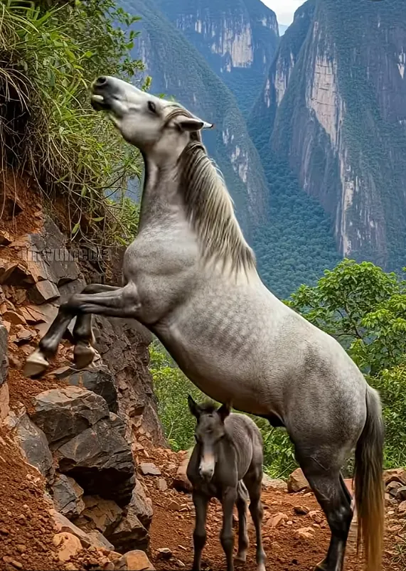 The first seconds of the footage feel like a children’s story come to life: an open meadow painted gold by the setting sun, a mother horse and her newborn foal grazing quietly in the distance. Then, suddenly, the calm breaks. The mother takes a wrong step, her front legs plunging into a soft patch of earth — a sinkhole hidden beneath the grass.