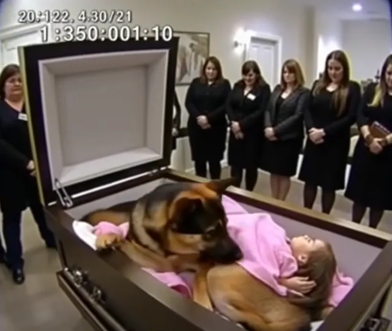 Yet as mourners gathered around the small white coffin, a palpable unease settled over the crowd, centered on one unexpected figure: the family’s German Shepherd, Max. His sharp eyes never left the casket, his low whines piercing the heavy silence like a quiet alarm.