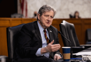 Senator John Neely Kennedy didn’t enter the federal press chamber so much as erupt into it. Reporters barely had time to stand before he marched to the podium with a binder the color of a warning flare, its cover stamped in block letters: