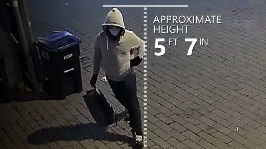 The suspect is seen in the video wearing a gray hooded sweatshirt, gloves, and a mask, carrying a backpack that investigators believe contained the devices.