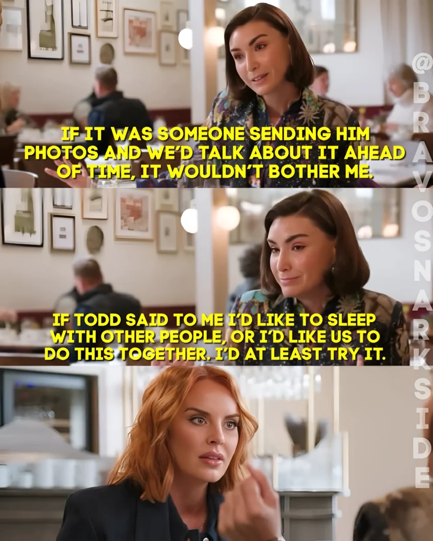 The conversation started with a discussion of boundaries and trust in a relationship. Bronwyn calmly explained that if her husband, Todd, were receiving photos from someone else and they had discussed it beforehand, “it wouldn’t bother me.”