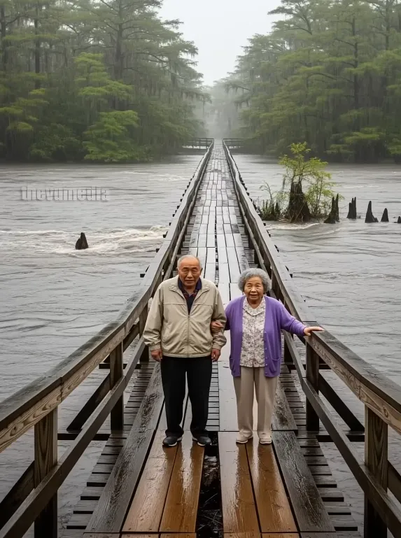 A roar echoes beneath the bridge — the sound of a flash flood tearing through the valley. The river swells violently, waves battering the old beams. Before the couple can react, the bridge trembles, groans, and collapses. Screams pierce the air as both are thrown into the churning brown water below.