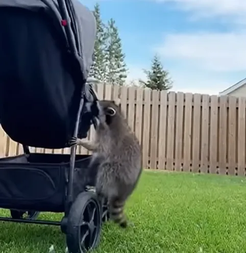 At 7:42 a.m., home security footage captured a wild animal charging toward a baby playing on a front lawn. Just as the predator lunged, a