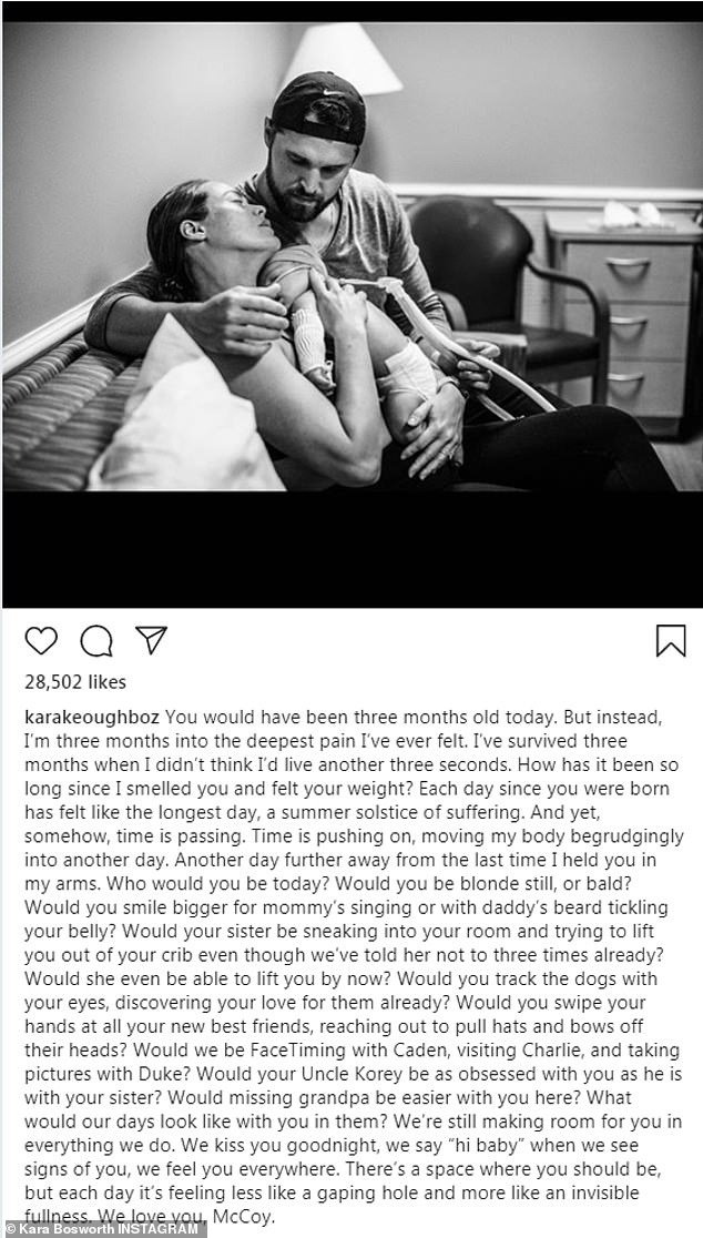Heartbreak: Kara Keough Bosworth penned a heartbreaking tribute for McCoy on Monday, the day he would have been three months old, alongside a somber black and white photo before his death at six days old